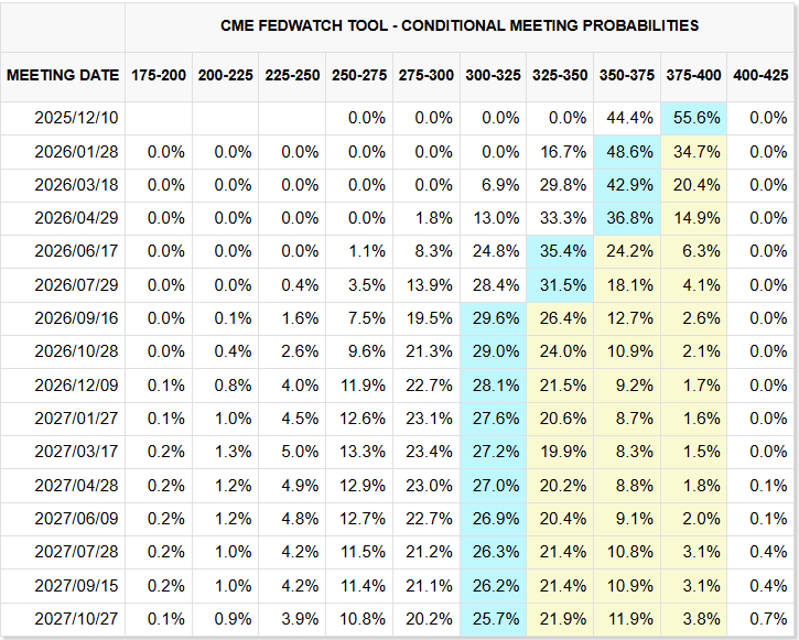 次回のFOMCは12/10ですが、利下げが55%程度まで減少しています。